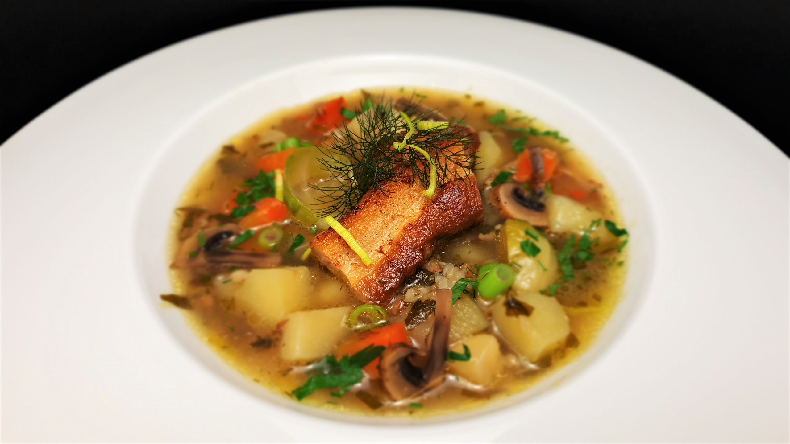 Autumn broth with crispy pork belly, barley, mushrooms and autumn vegetables