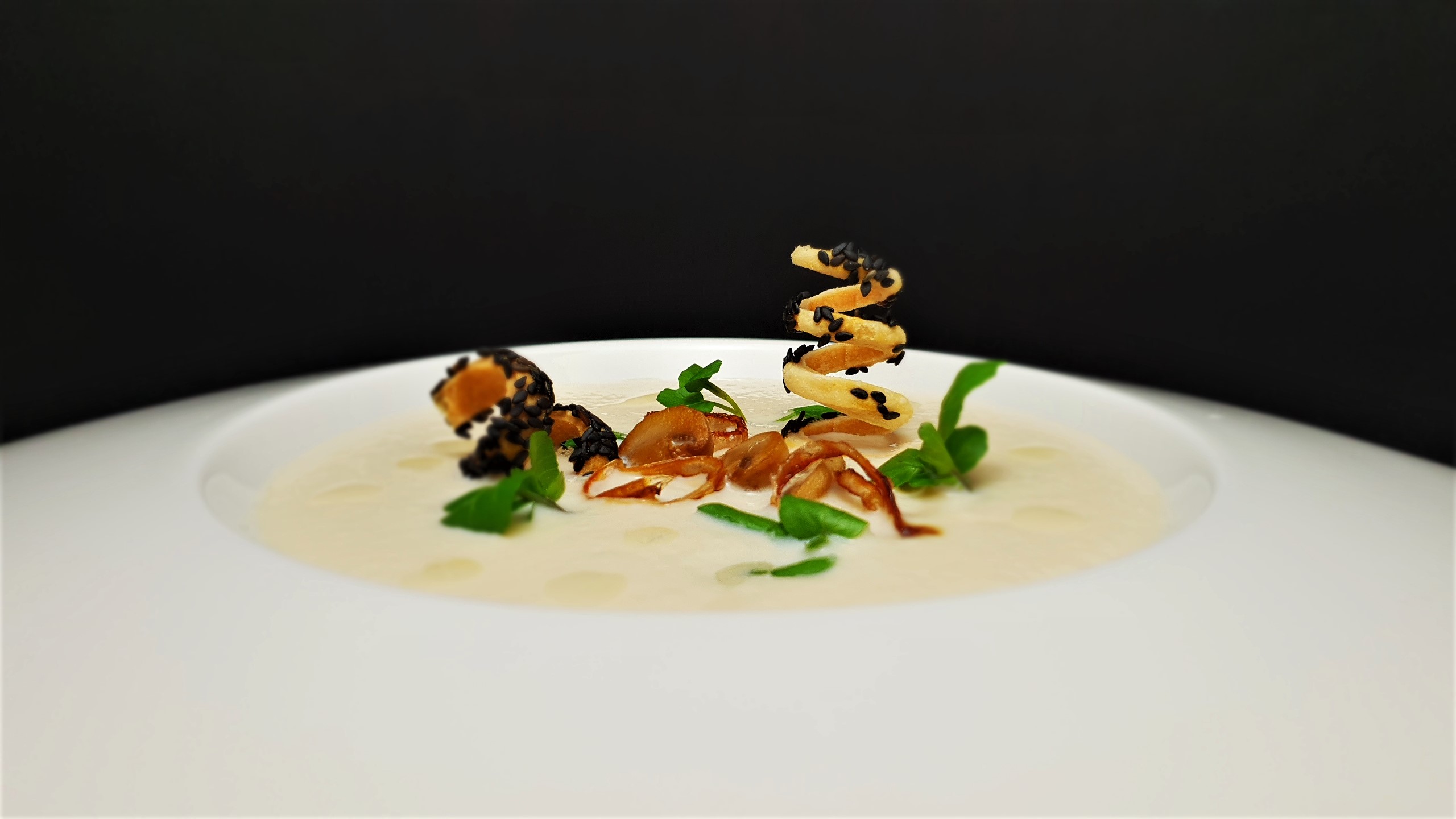 Cauliflower and white truffle oil soup, black sesame, mushroom, shallots