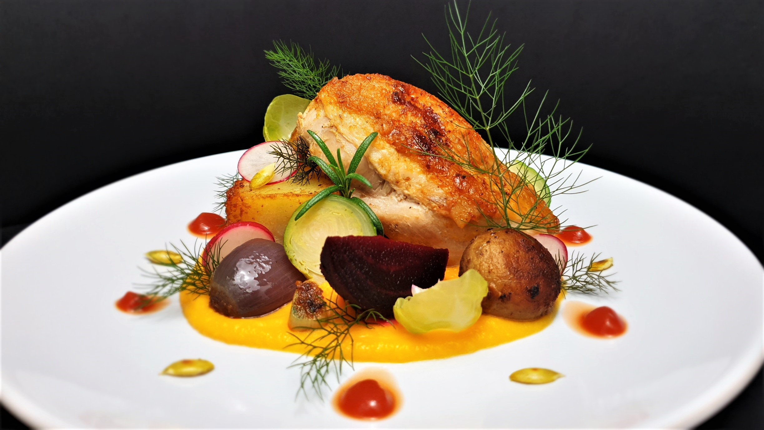 Halloween chicken breast , Bloody Merry sauce, spicy pumpkin puree, beetroot, sprout, mushroom, rosmaryn potato fondant