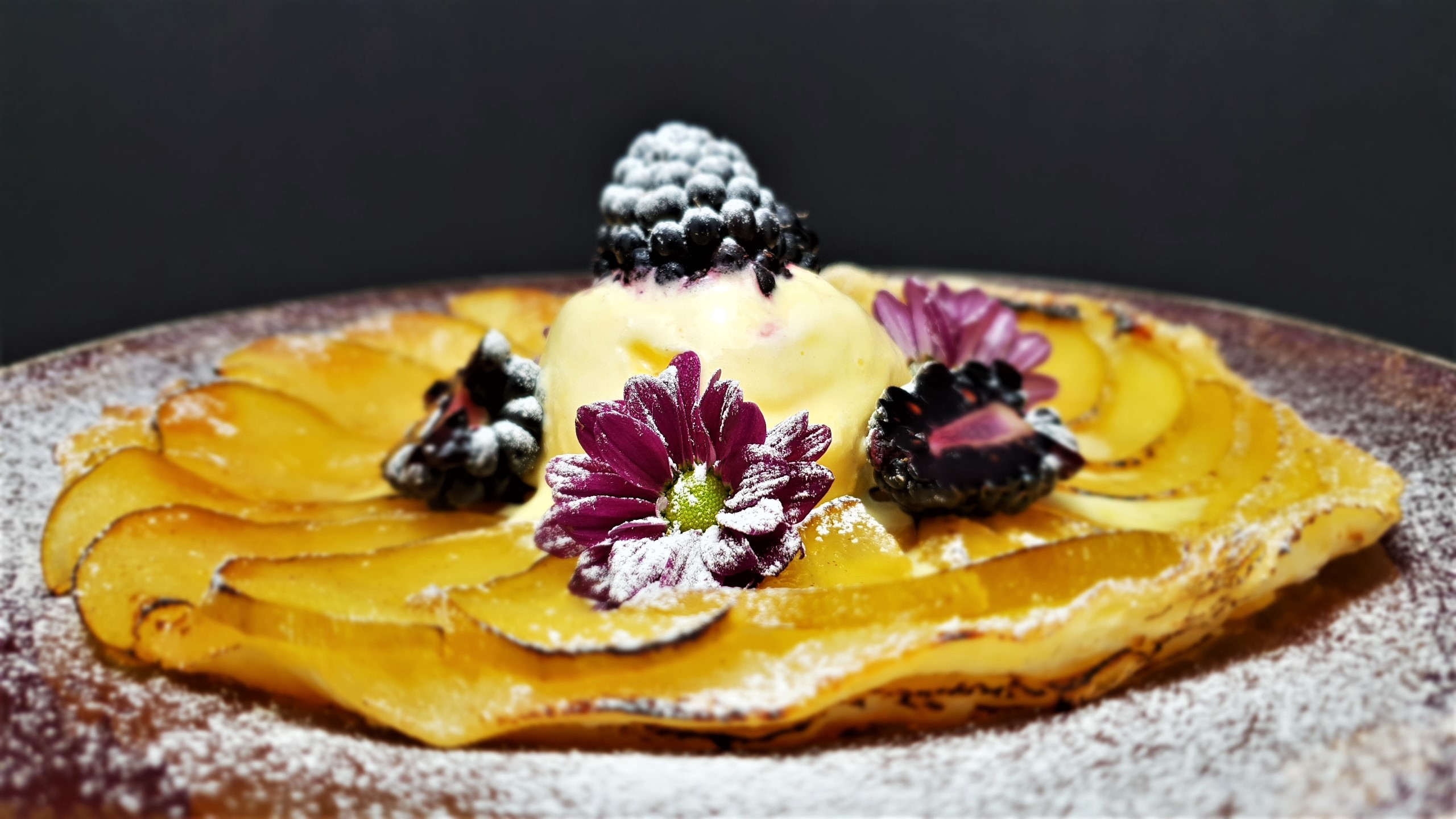 Apple tart tatin, cinammon sugar, clotted cream ice cream, blackberry