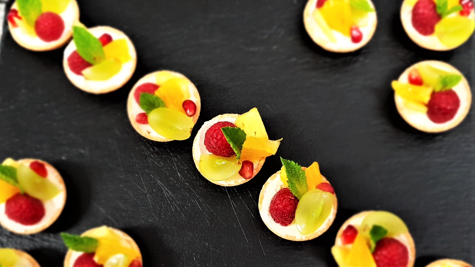 Mascarpone vanilla cheesecake, summer fruits, peach puree