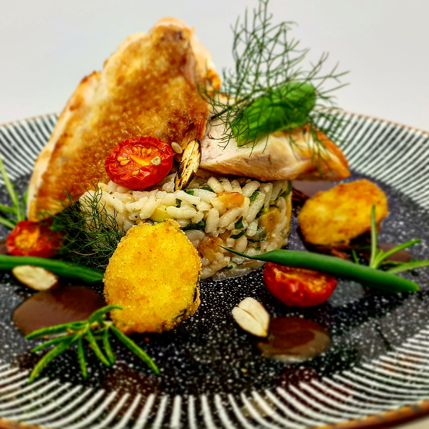 Free range chicken fillet, green vegetables and herbs risotto, confit cherry tomato, crispy courgette, smoked almonds, port jus
