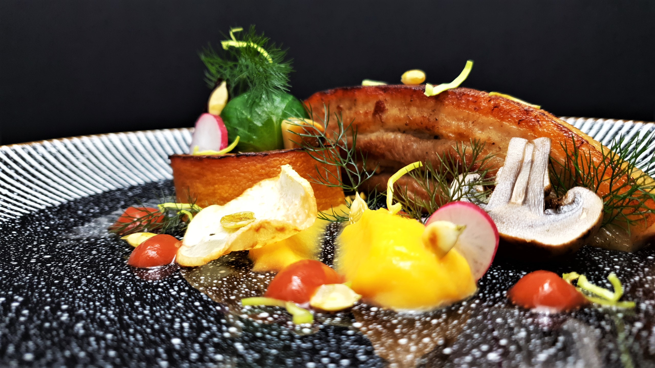 Roast pork belly, pumpkin puree, celeriac crisp, chorizo and smoked chilli tomato sauce