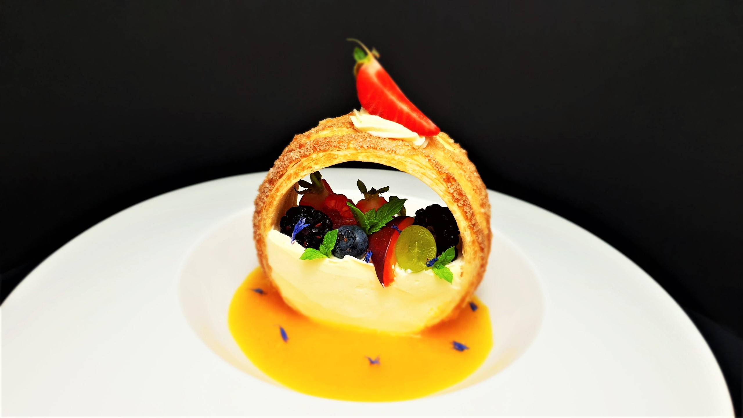 Cut puff pastry in to 7mm width strip, roll pastry on metal ring, glaze with egg coat with vanilla and cinnamon sugar, bake 180C for approx. 15min , leave to cool .