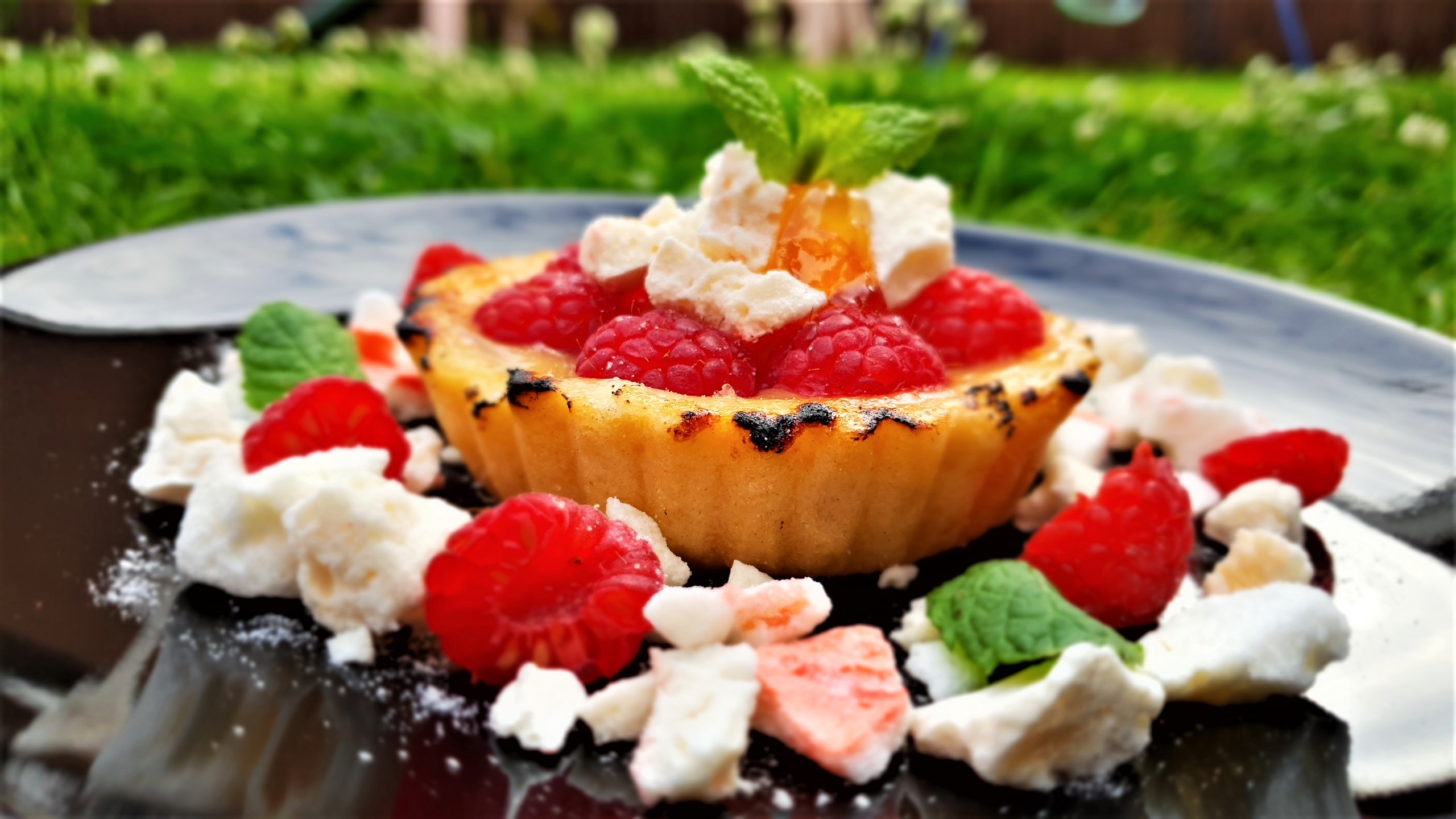 Lemon and raspberries meringue tart, pink garapefruit marmolade