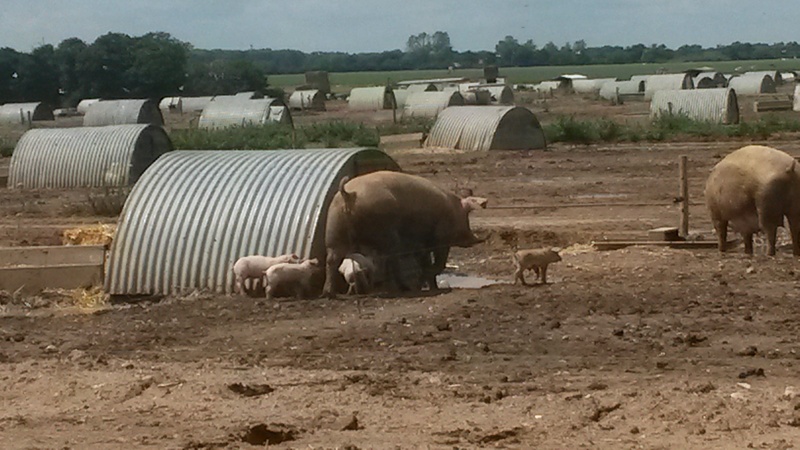 They have shelter when they need it, in the form of large airy tented barns in each paddock with plenty of bedding straw. This extra space and activity not only ensures a vastly improved standard of living and welfare, but also results in the pigs growing at a slower rate, for the simple reason that they are burning off more calories than a pig enclosed in a concrete pen for all of it's life.